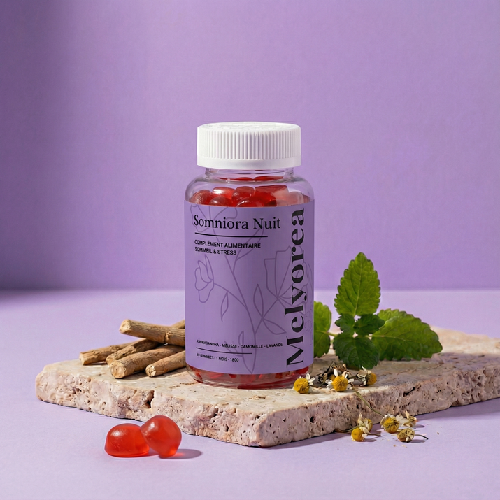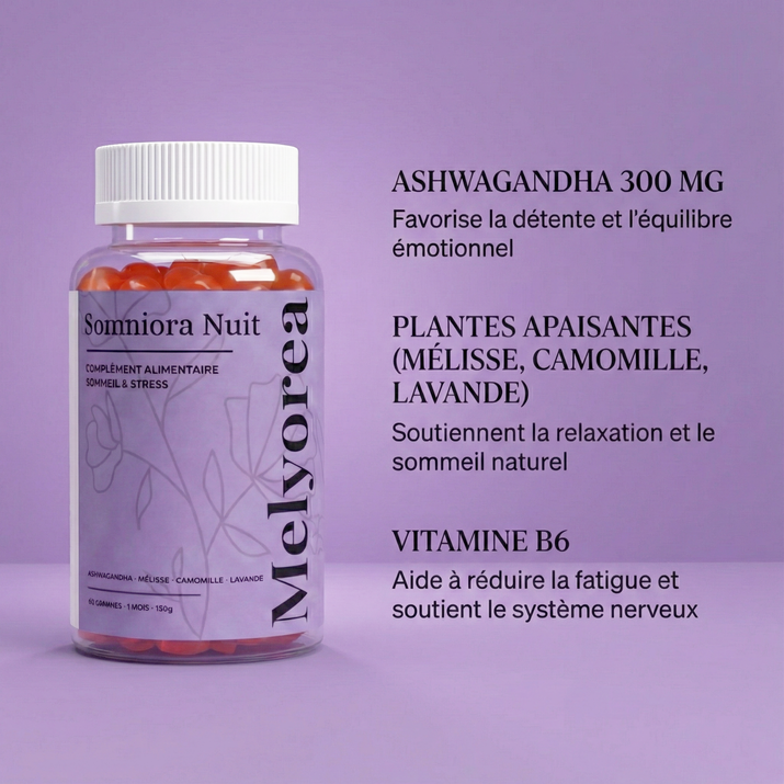 Somniora Nuit de Melyorea associe : ashwagandha (300 mg d’extrait standardisé à 5 % de withanolides), mélisse, camomille, lavande et vitamine B6, dans des gummies véganes, sans hormones ni mélatonine.