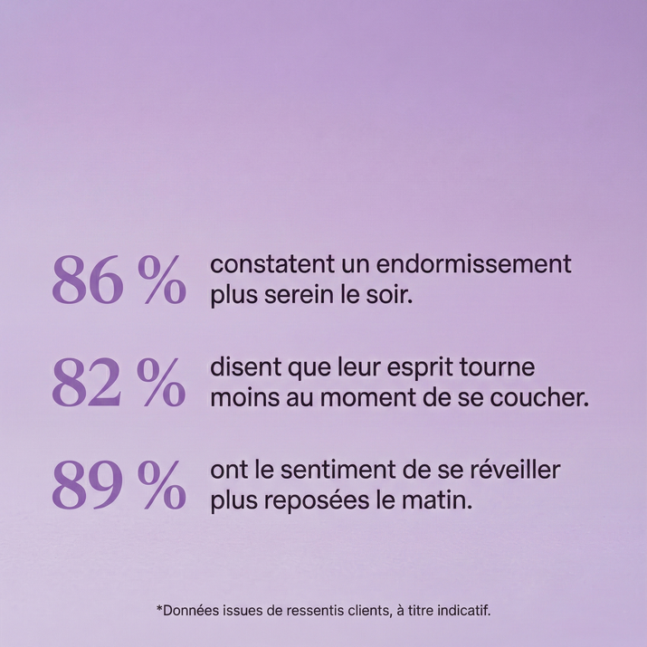 Somniora Nuit n’est pas un somnifère médicamenteux. Les clientes décrivent surtout un moment de relâchement naturel, sans se sentir “assommées”, avec une fin de journée plus calme et un esprit moins chargé.